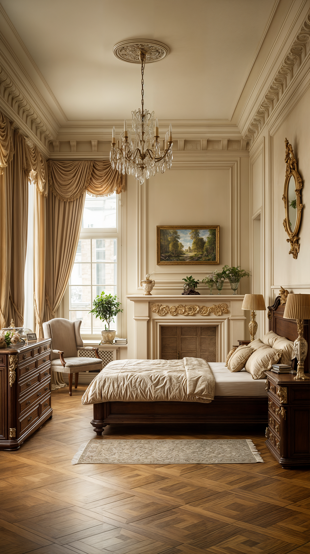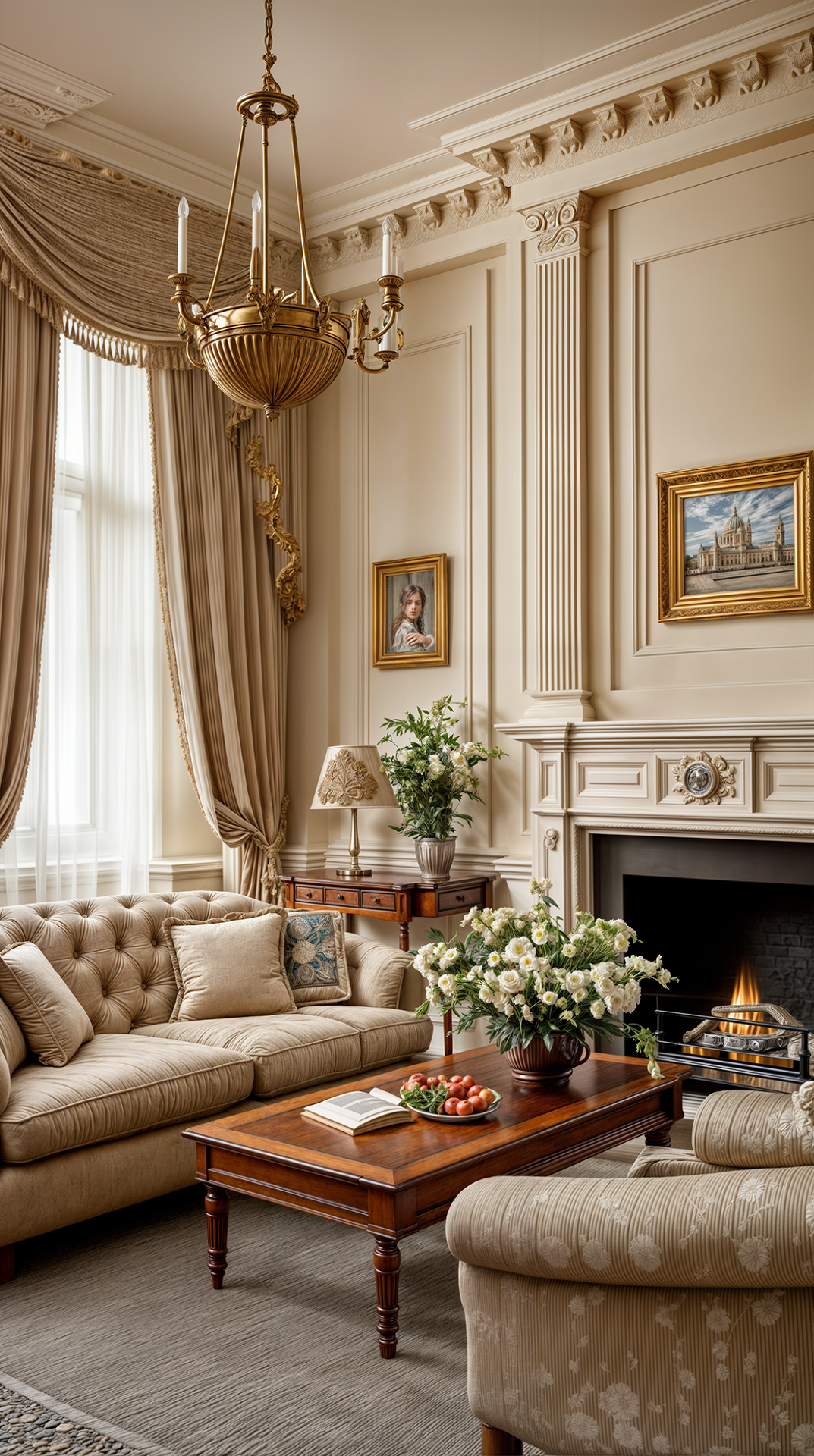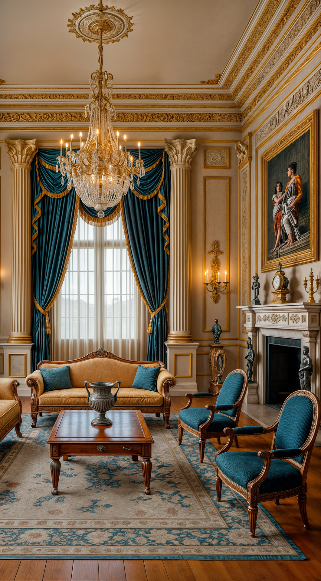 ДЕКОР: всё подчинено симметрии и уравновешенности. Присутствуют зеркала в строгих рамах, бюсты, античные статуи, классические картины и гравюры в рамах, светильники на пьедесталах. Центральное место занимает камин с колоннами или фронтоном. Текстиль благороден и сдержан — шторы из плотной ткани с подхватами, прямые портьеры. Всё работает на ощущение спокойного достоинства и культурного вкуса.