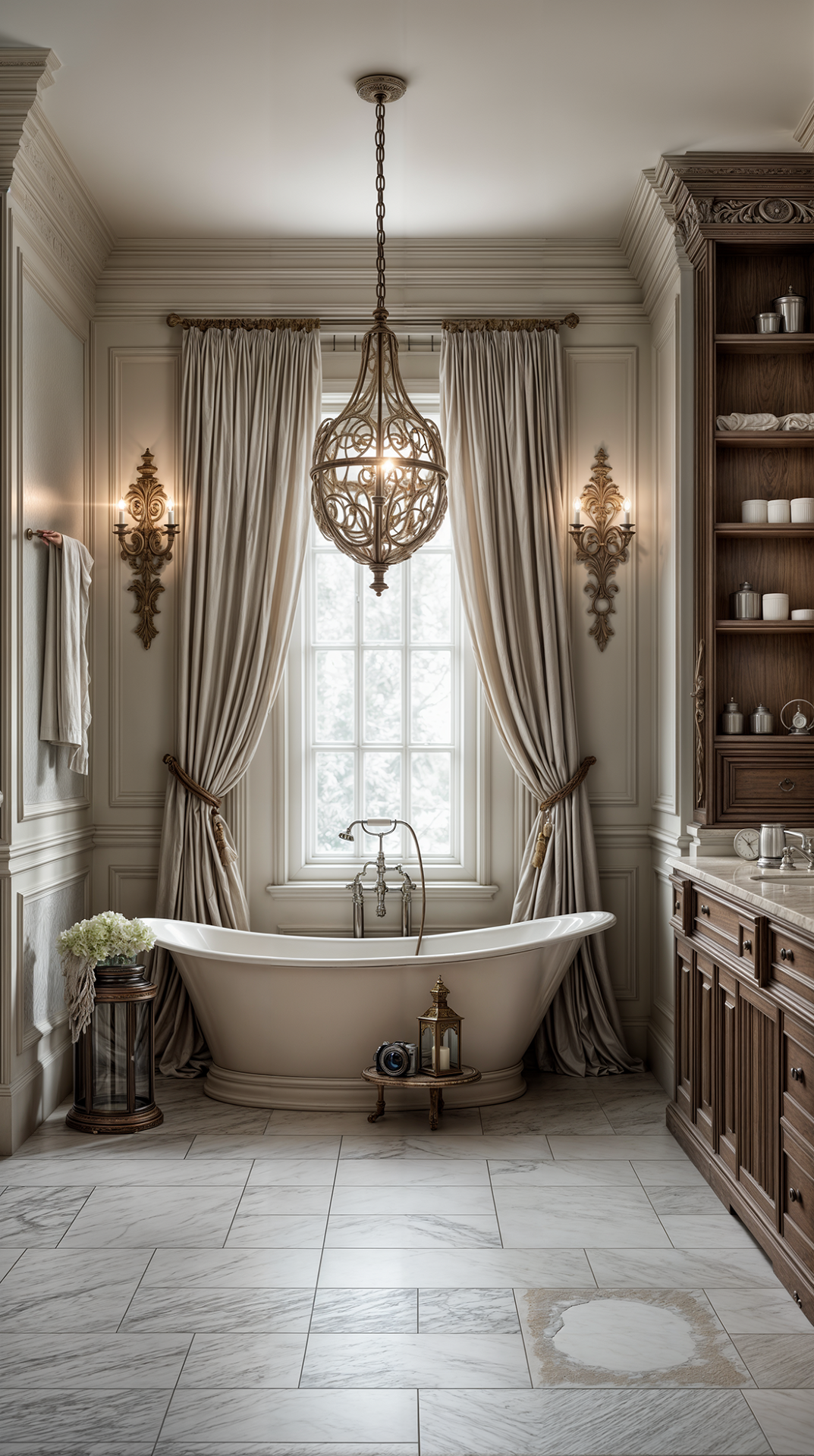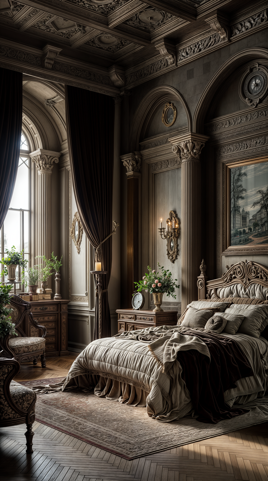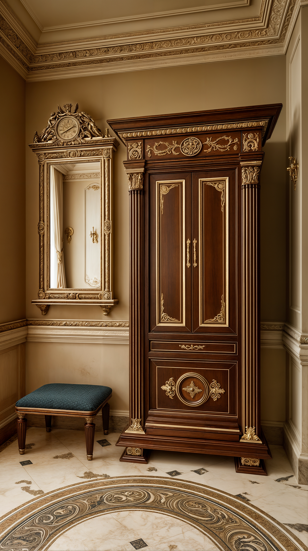 ДЕКОР: всё подчинено симметрии и уравновешенности. Присутствуют зеркала в строгих рамах, бюсты, античные статуи, классические картины и гравюры в рамах, светильники на пьедесталах. Центральное место занимает камин с колоннами или фронтоном. Текстиль благороден и сдержан — шторы из плотной ткани с подхватами, прямые портьеры. Всё работает на ощущение спокойного достоинства и культурного вкуса.