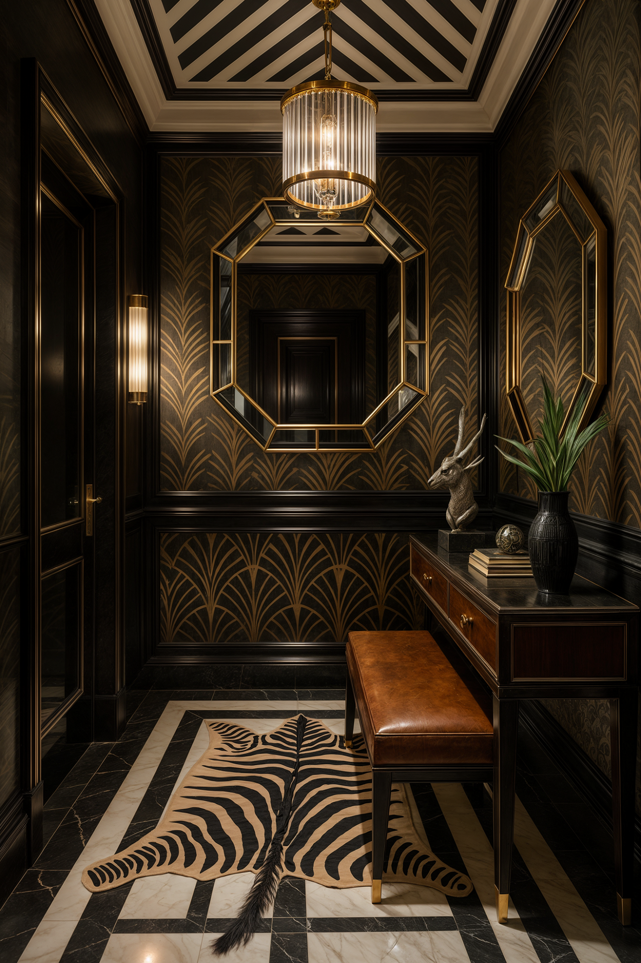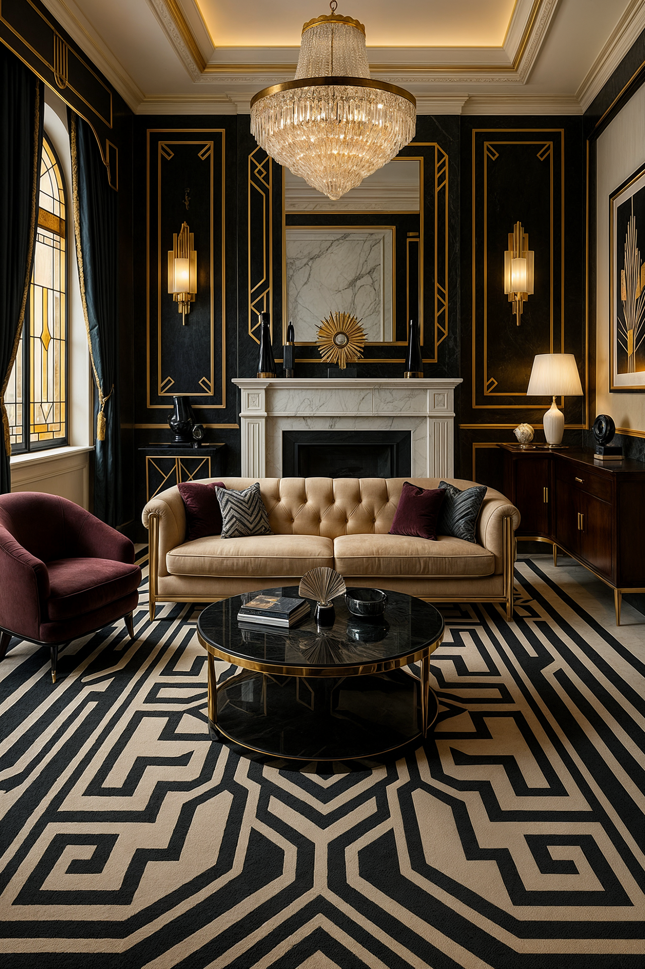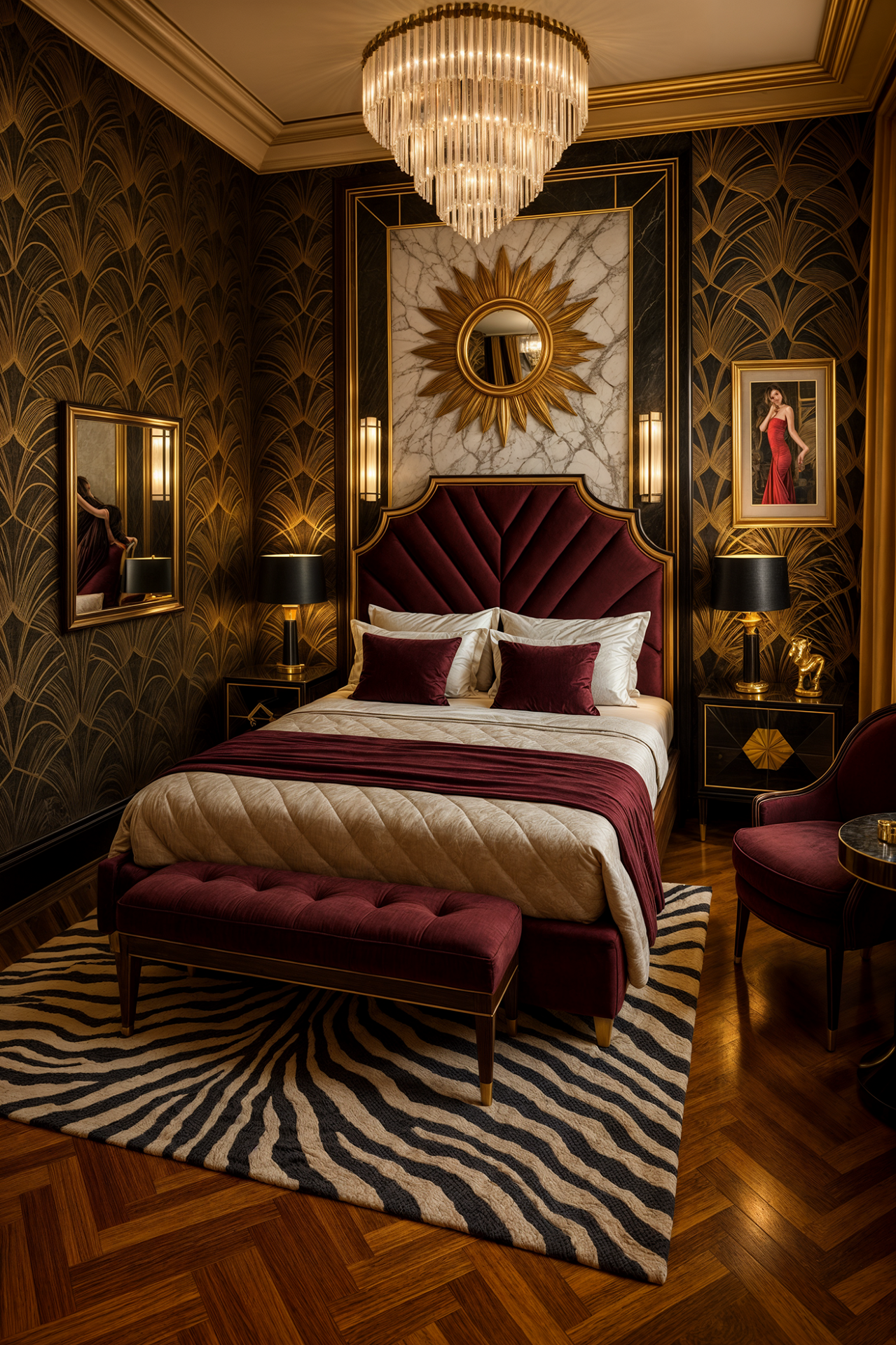 ДЕКОР: как следует из самого названия стиля, он декоративный. Геометрические орнаменты на любых поверхностях (даже растительные мотивы упрощены в угоду чёткости, графичности). Зеркала. Про экспедиции я упоминал, поэтому - этнические мотивы (вазы, статуэтки, восточные ковры, шкура зебры...). Картины и постеры с небоскребами, винтажной рекламой и персонажами в стиле ретро. Большое внимание уделяется освещению.