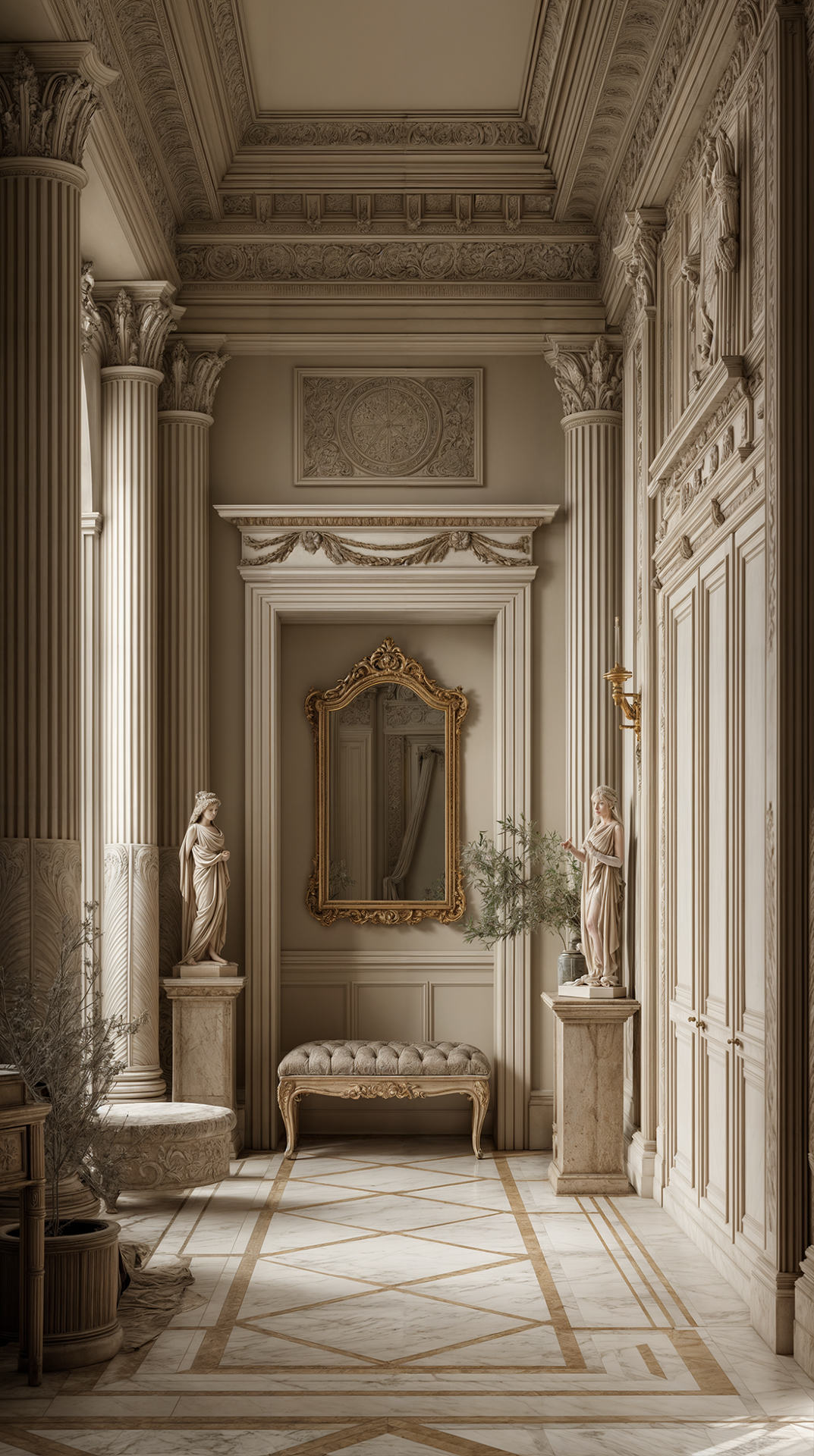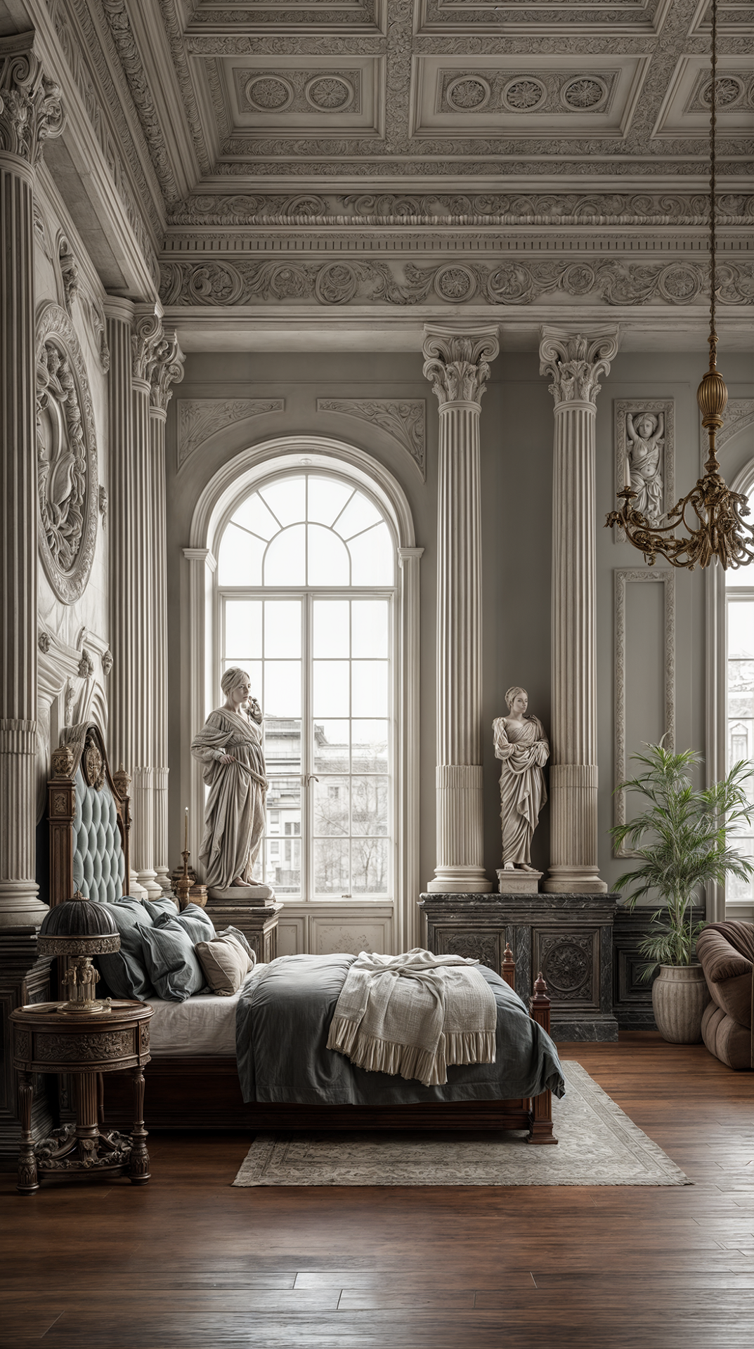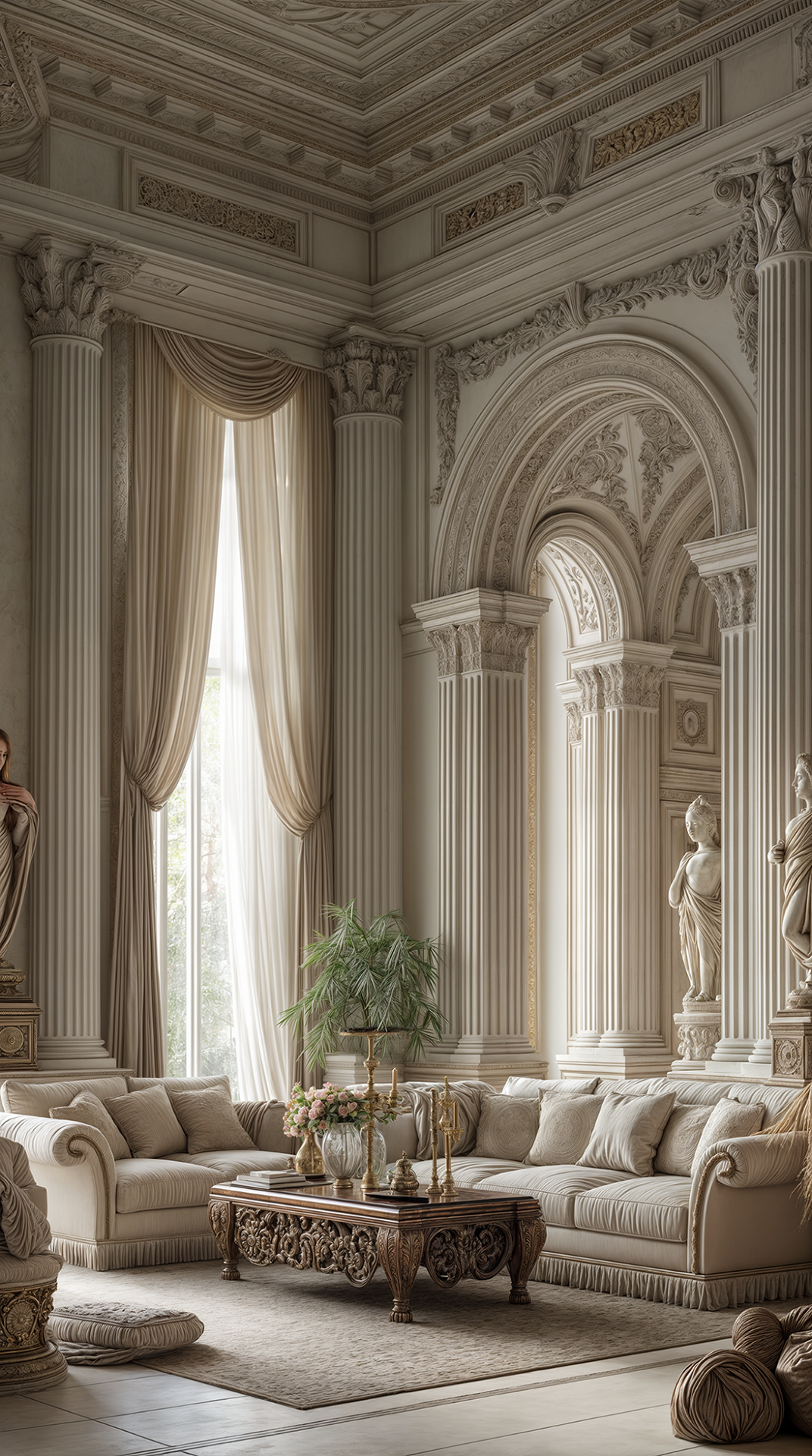 КОМПОЗИЦИЯ ПРОСТРАНСТВА: античный стиль предполагает большие пространства и высокие потолки - именно тогда его элементы (скульптуры, пилястры, колонны и обилие лепного декора) смотрятся наиболее эффектно и оправданно. Тут принцип «золотого сечения» в построении композиции играет главенствующую роль - гармония визуального восприятия пространства важна, как никогда.