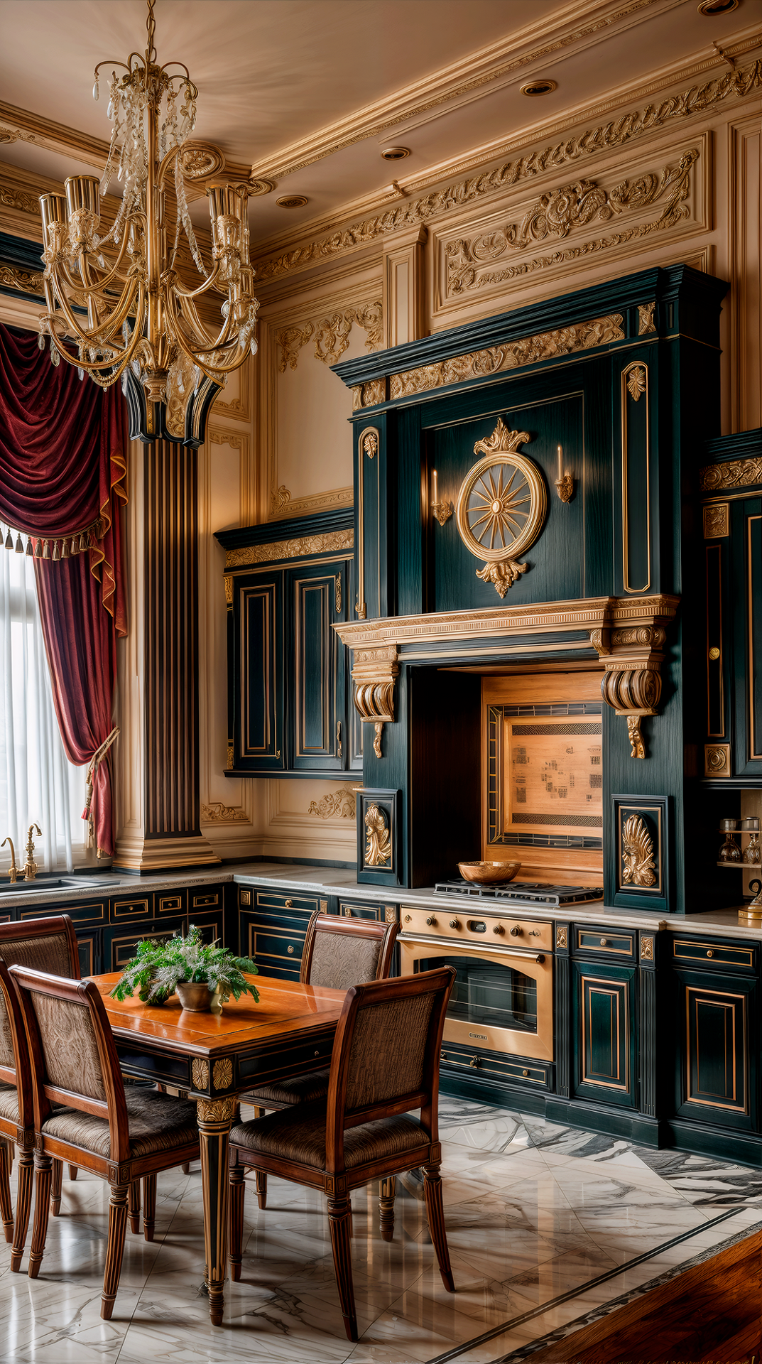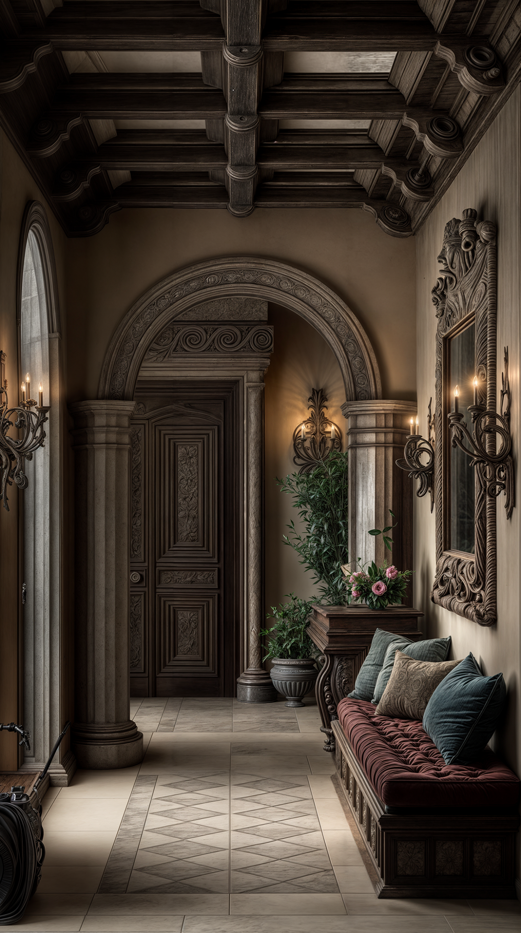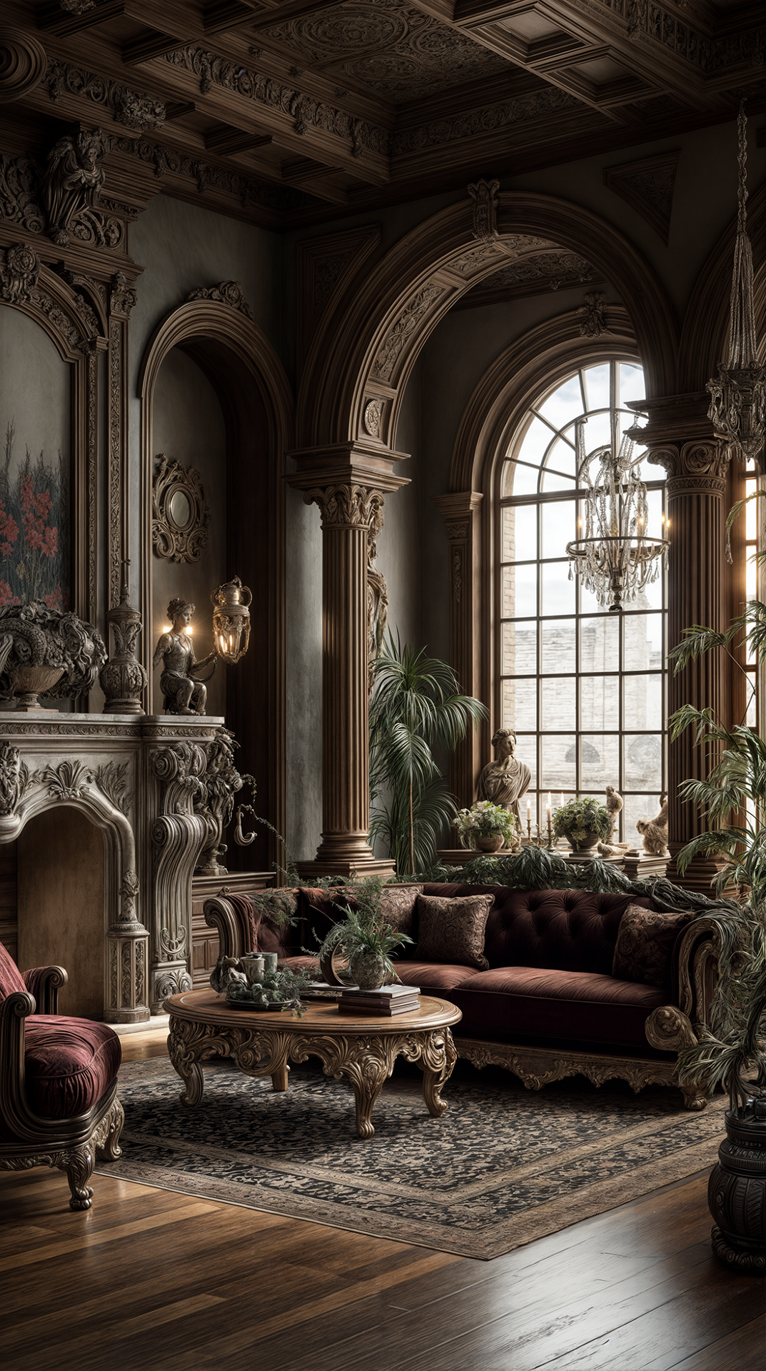 ДЕКОР: подчеркивает образованность хозяина — в декоре часто встречаются бюсты, скульптуры, глобусы, гербы, античные орнаменты. Зеркала в строгих рамах, камины с барельефами, драпировки из тяжёлых тканей, мозаика. Украшения не стремятся к вычурности, но всегда несут эстетическую или символическую нагрузку. В Ренессансе красота — это разум, воплощенный в форме.