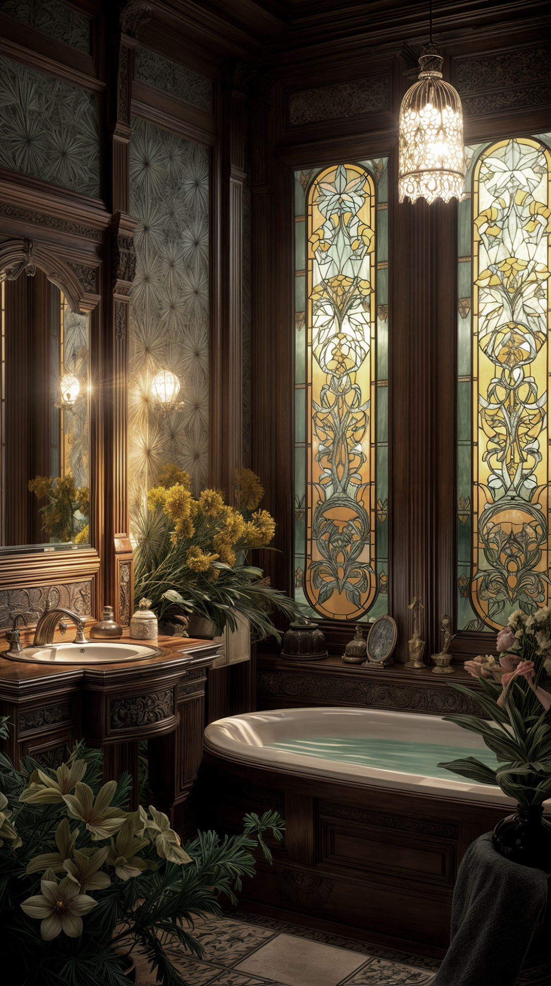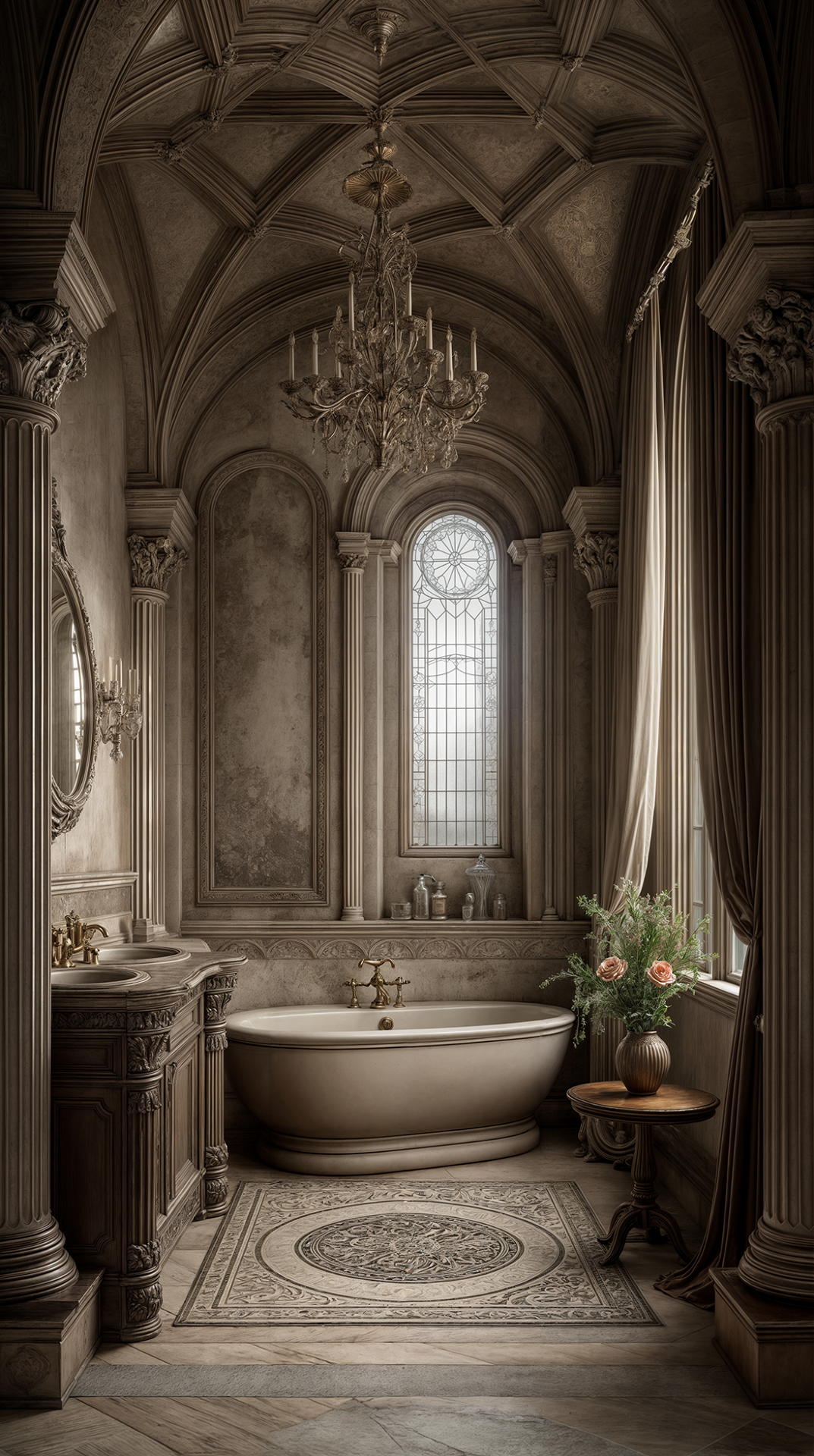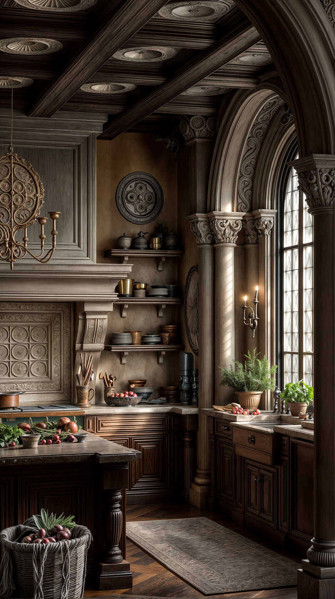 ДЕКОР: о витражах я уже написал, о барельефах и кованых элементах тоже; текстиль - плотный, тяжёлый, есть ковры... А! Обязателен камин!!!
