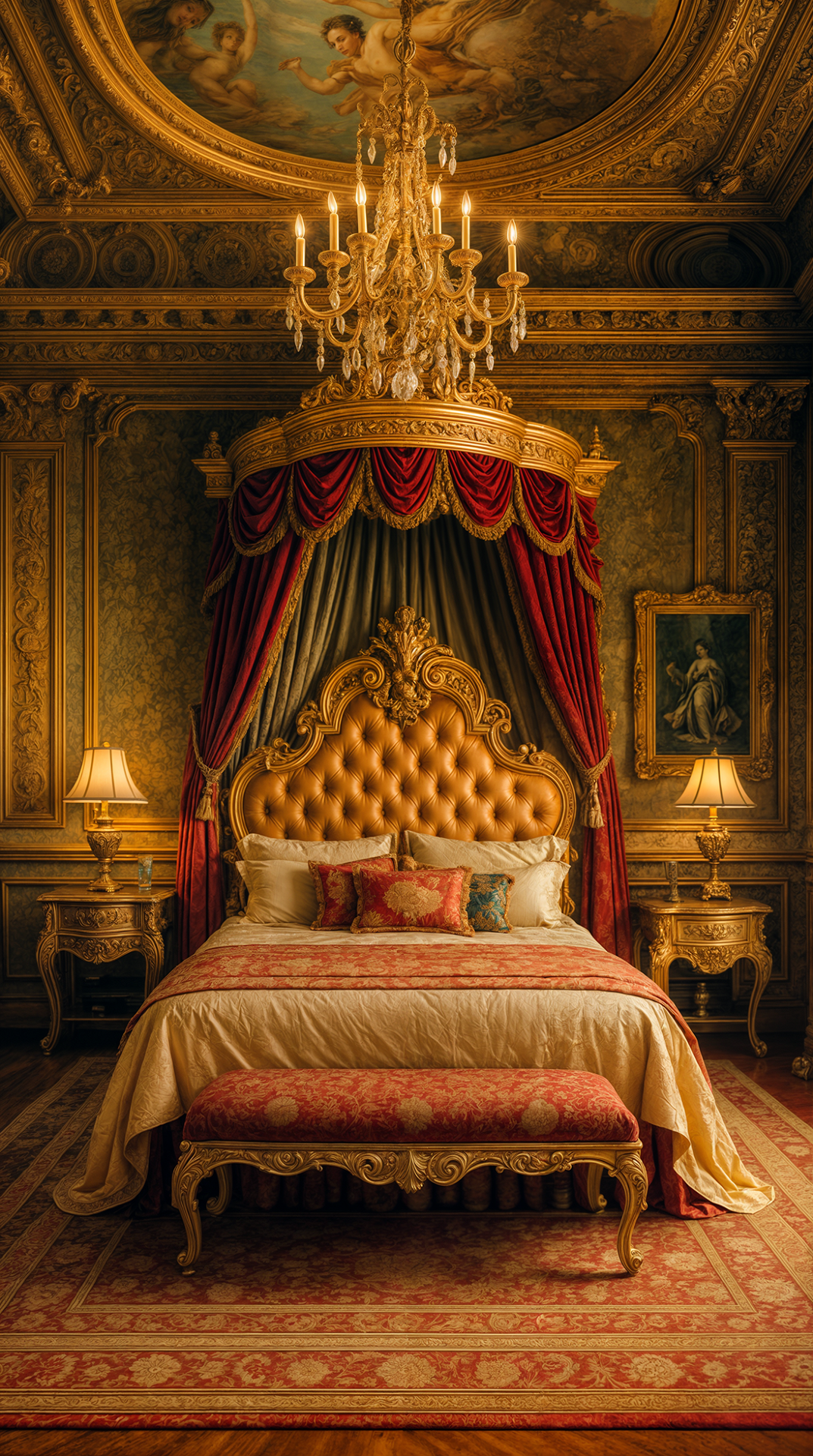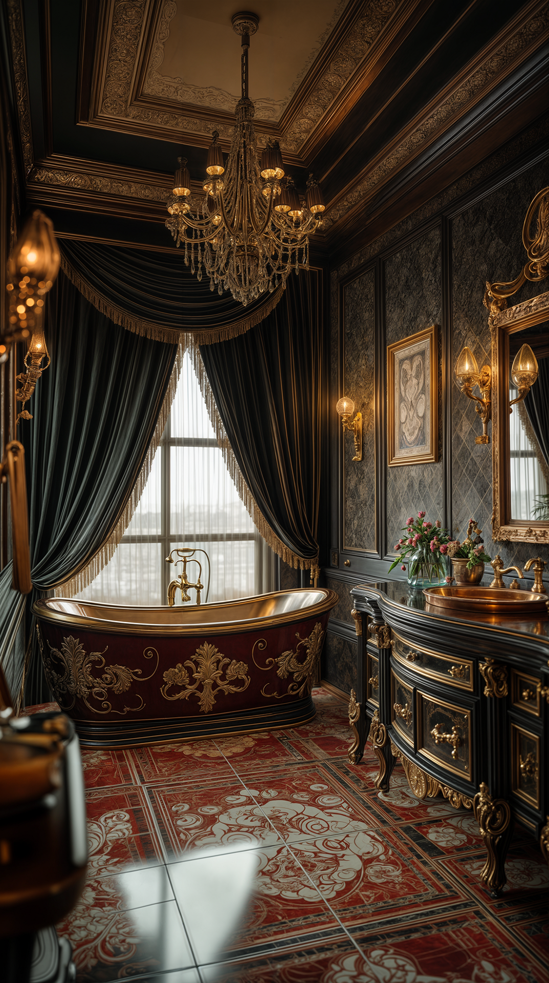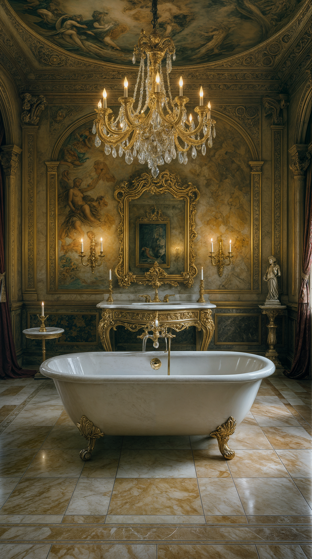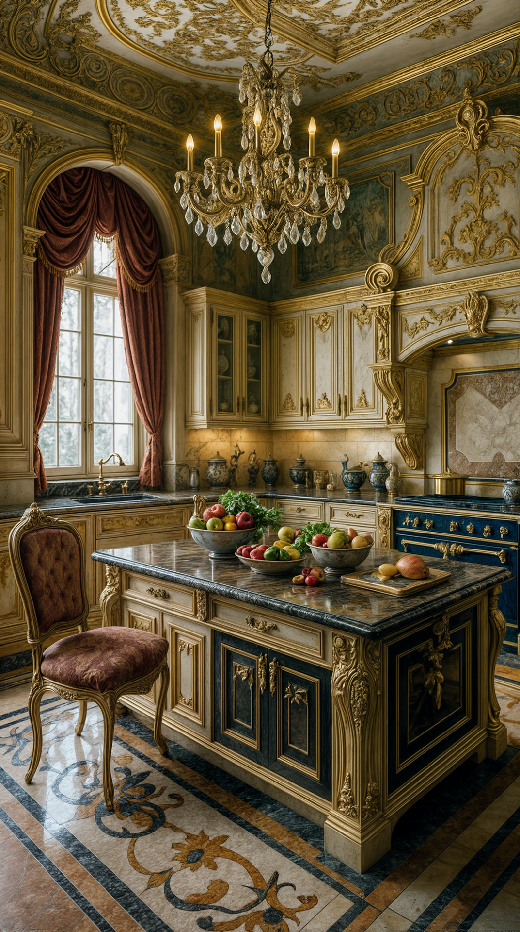 ДЕКОР: позолоченная отделка, фрески, барельефы, статуи фантастических животных и бюсты известных личностей, зеркала и картины в дорогих рамах, бронзовые шкатулки, канделябры и часы, античные вазы и статуэтки, В текстильном оформлении окон используются ламбрекены и кисти.