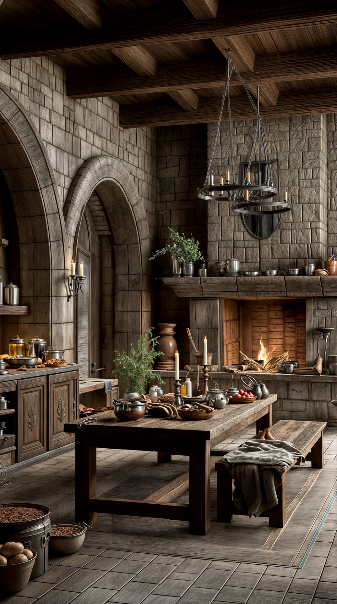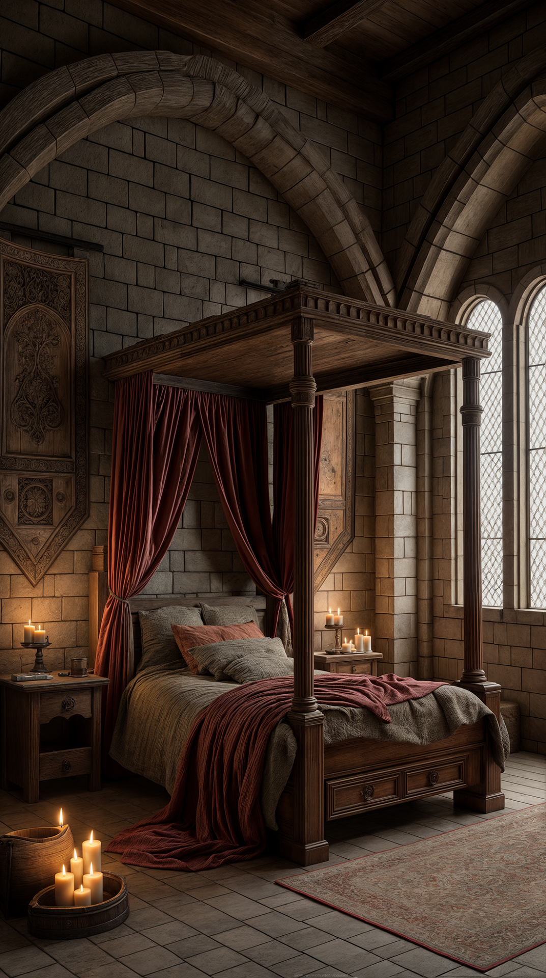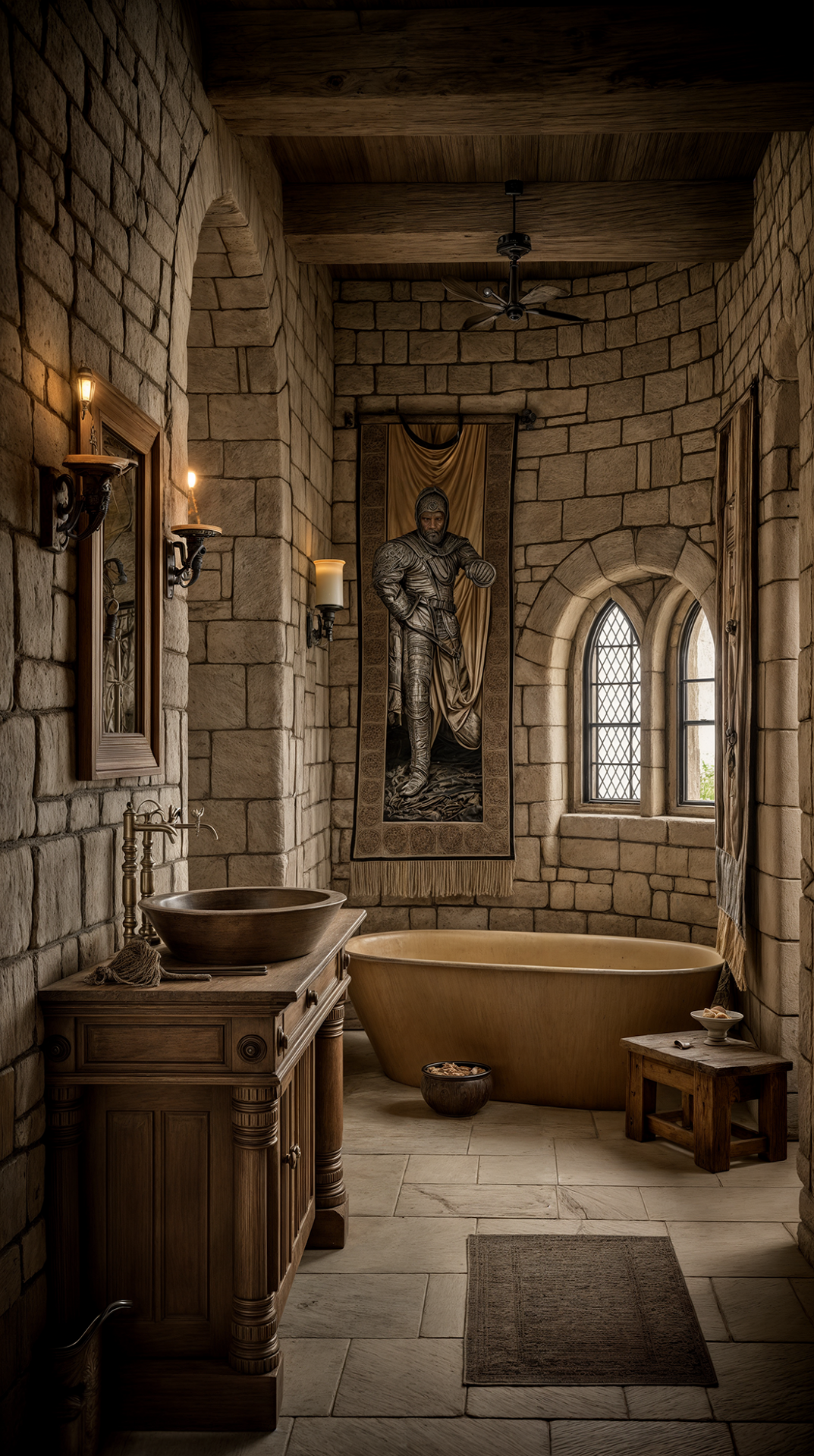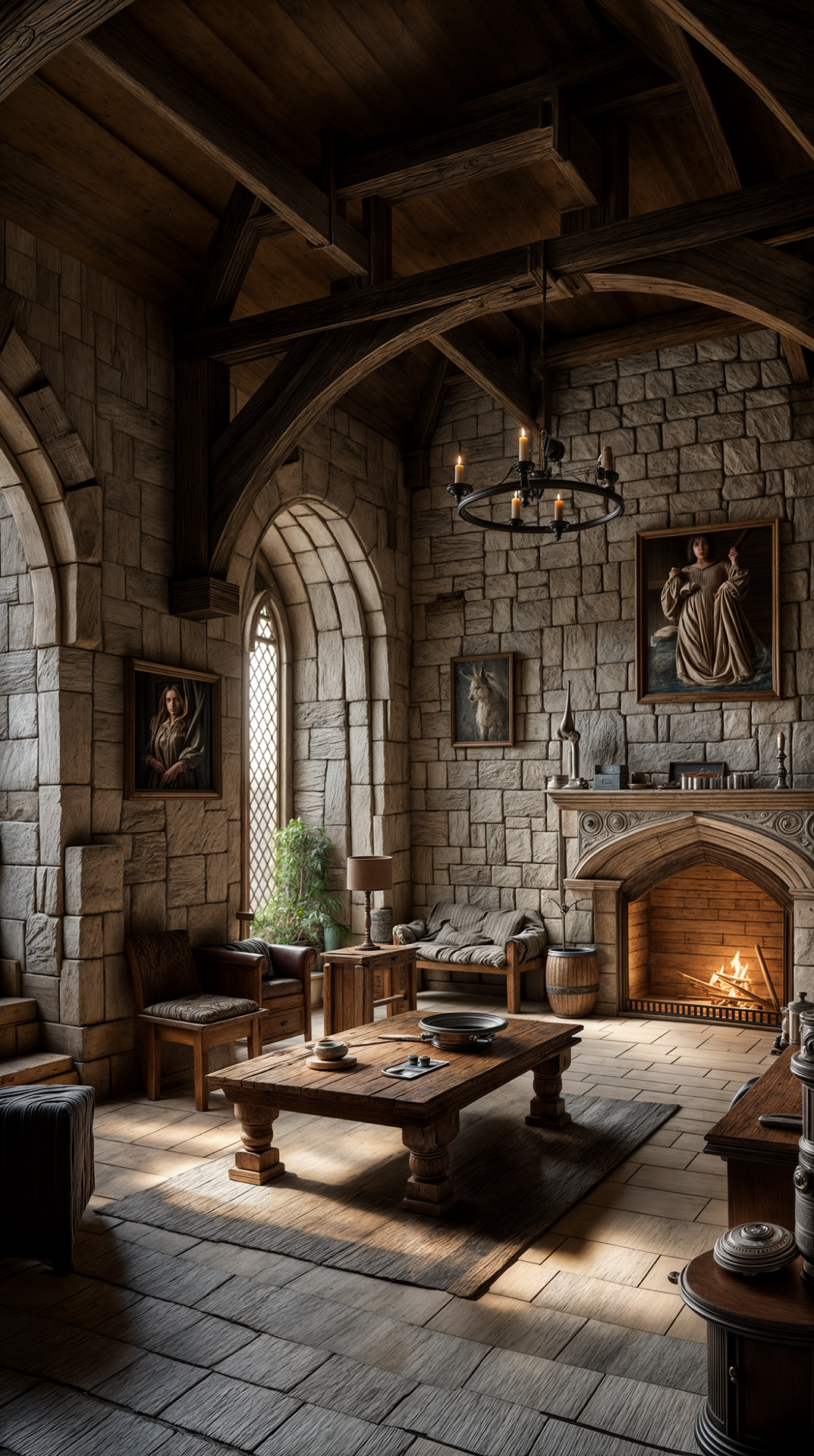 ДЕКОР: после Крестовых походов в интерьерах появились восточные ковры и шелковые ткани. А основным декором стен считался гобелен с мифологическими или библейскими сюжетами (кроме красоты он был еще и функциональным - защищал от сквозняков). Стены также украшались аксессуарами рыцарской тематики (мечами, щитами, доспехами), охотничьими трофеями, а позже и картинами.