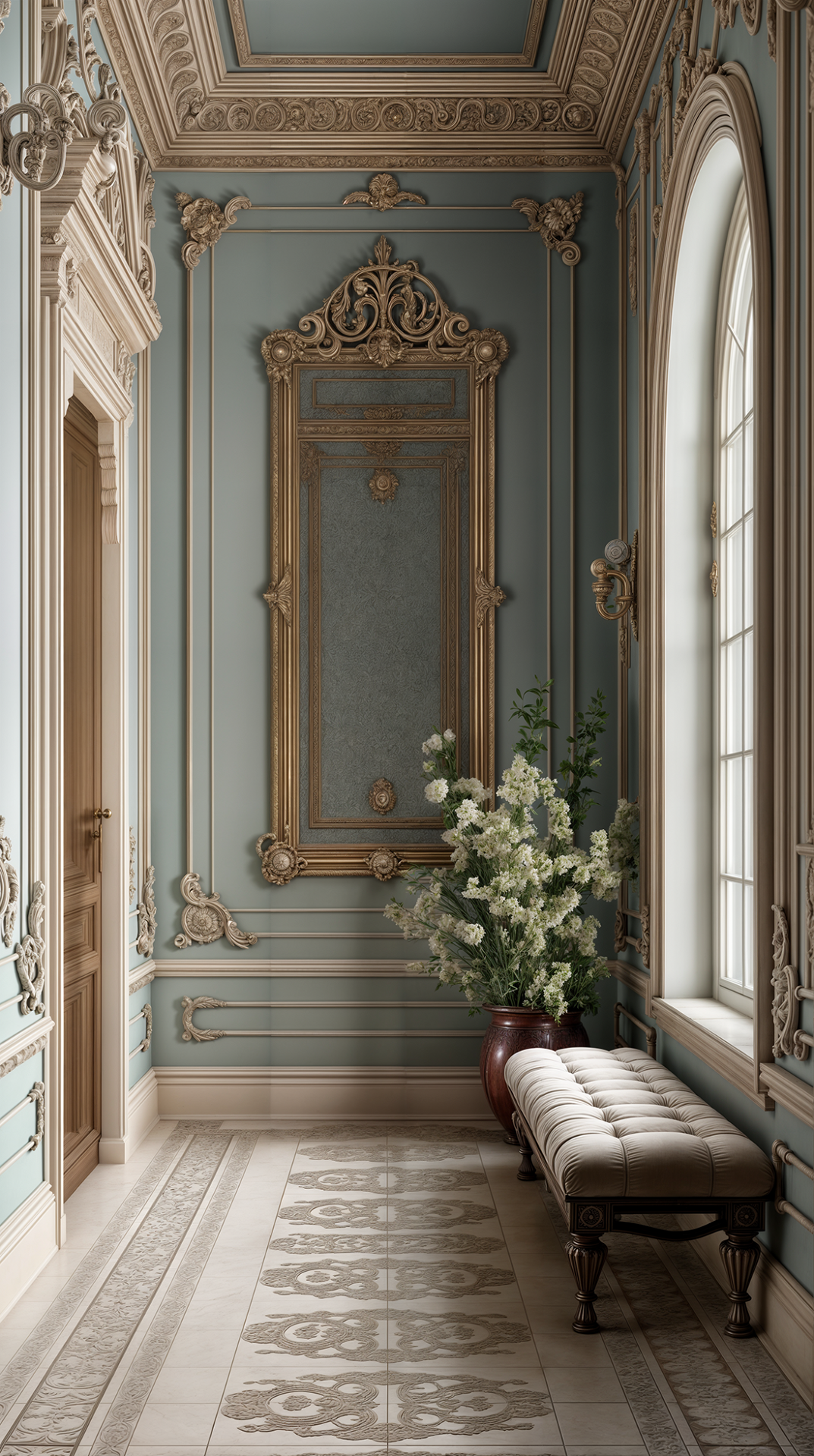 КОМПОЗИЦИЯ ПРОСТРАНСТВА: строго симметричная, построенная по законам геометрии. Четко выделены оси, центр, равновесие масс. Потолки, как правило, сводчатые или кессонные, высокие. Интерьеры кажутся устойчивыми, монументальными и «вечными». Важны пропорции — ничто не должно казаться чрезмерным или случайным.