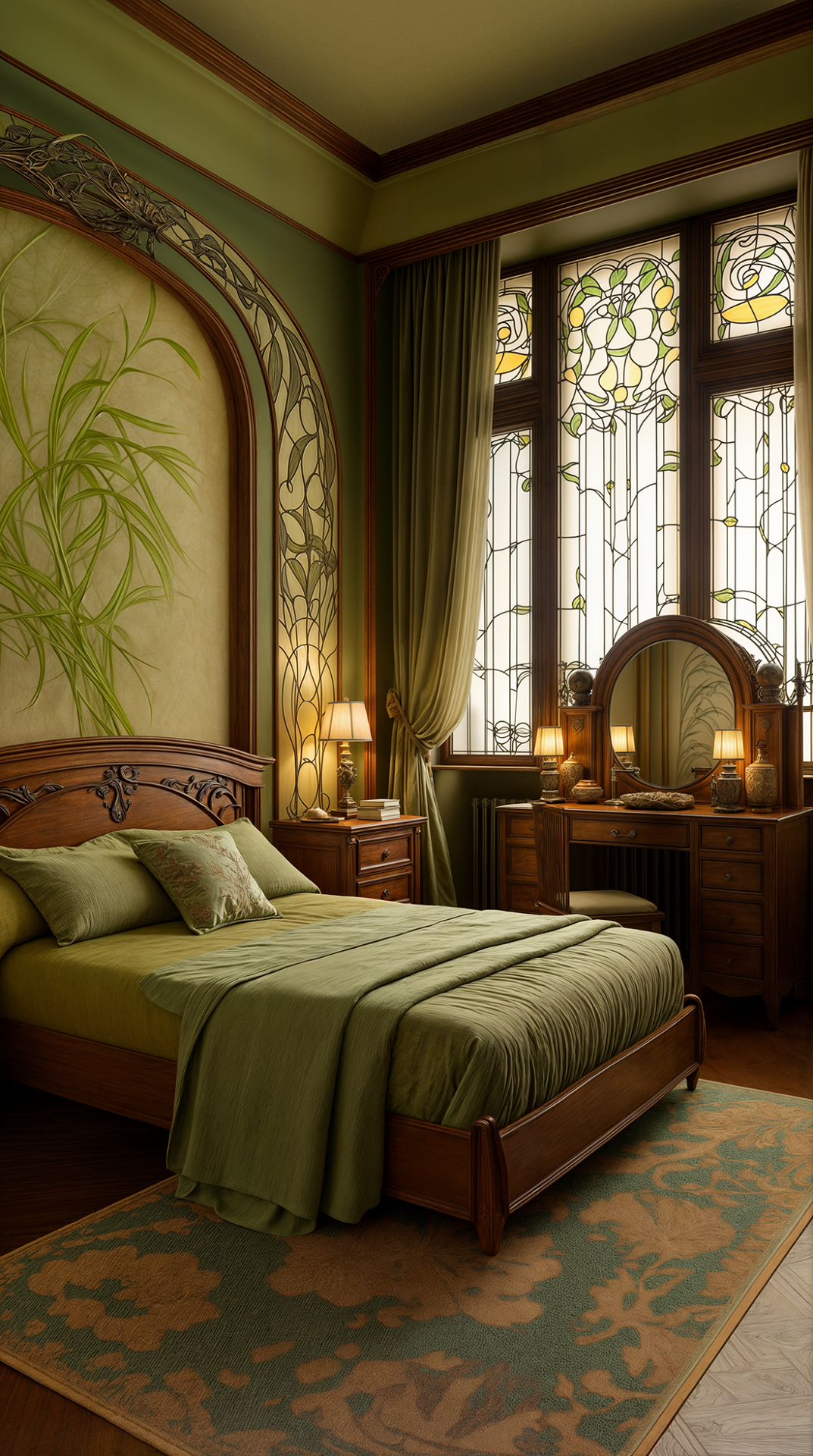 ОТДЕЛОЧНЫЕ МАТЕРИАЛЫ: на первое место выходит тёмное дерево в своём исконном виде - без окраски, с текстурой. От классики в модерн перешла лепнина, но изменился её орнамент. Обои в модерне, скорее, для потолка, чем для стен - и обязательно с растительным рисунком. А на стенах может быть покраска или деревянные панели.